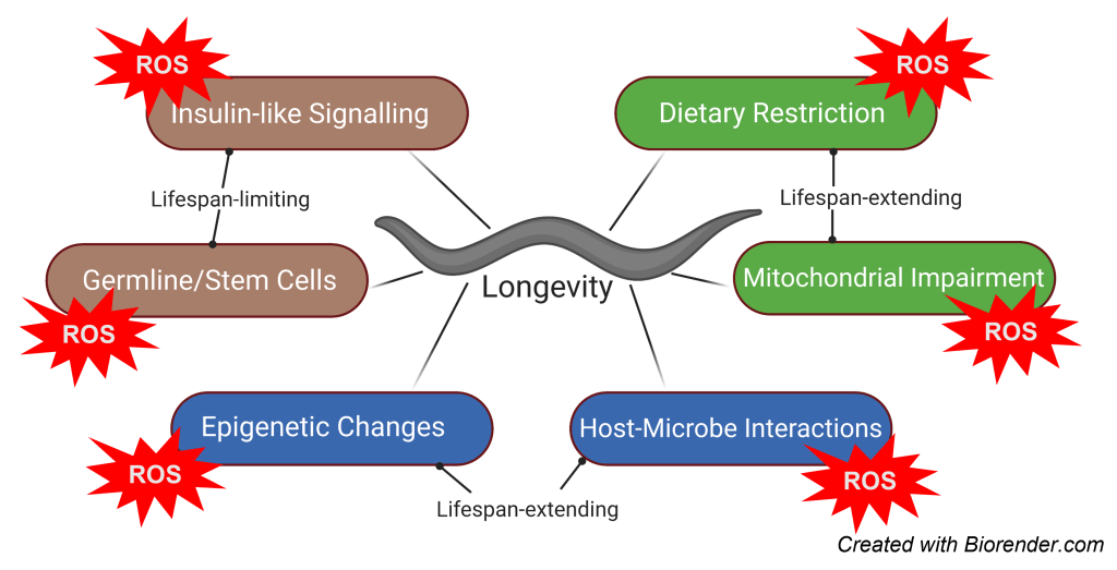 Project details: C. elegans is an invaluable model system for studies on aging, age-related diseases, and mechanisms of longevity. Lifespan-increasing mutations (e.g., mutation in daf-2 which disrupts the Insulin/IGF-1 signaling pathway) and regiments (e.g., dietary restriction, metformin) were found to impinge molecular signals which also shaped our understanding of mammalian aging. Moreover, ROS production (at low doses since higher doses are unquestionably detrimental) has shown to increase healthspan and lifespan via adaptive responses that involve improved defense mechanisms and stress resistance. However, whether known longevity modulators act independently of ROS or interact to regulate organismal lifespan, is yet unclear. To address this, we study 1) the role of ROS as a universally relevant signal for lifespan determination and 2) the implication of redox-regulated events as a downstream effectors of longevity interventions.