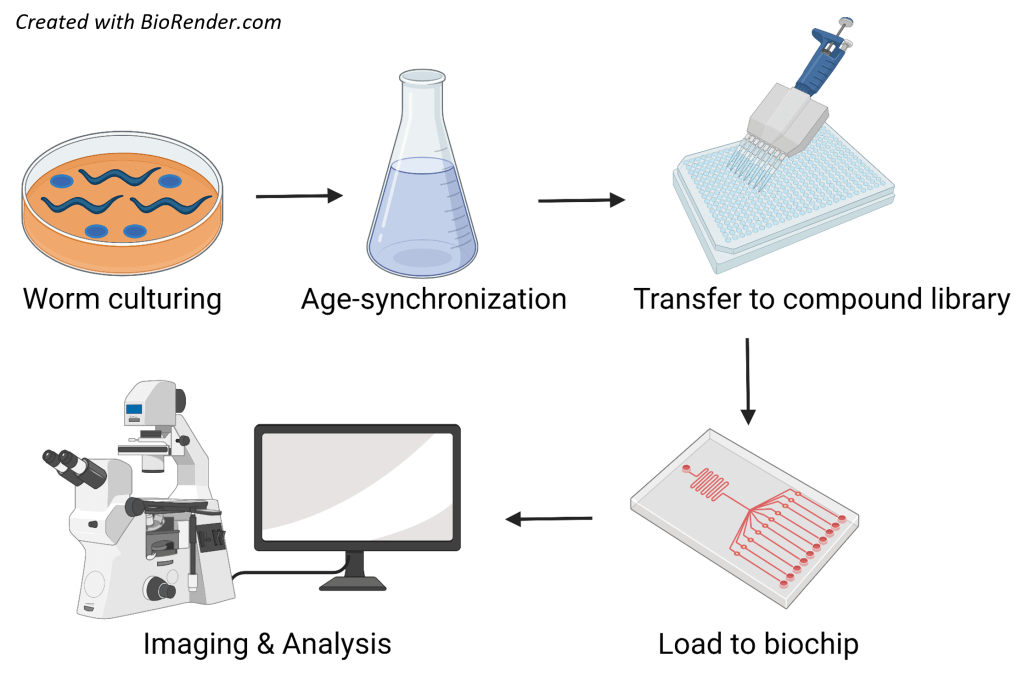 Project details: We use microfluidic-based platforms for a) high-throughput functional imaging of neurons and b) high resolution, whole-organism phenotyping. In the past, this technology allowed us to characterize the age-dependent, functional decline of C. elegans neurons and to perform a screen for the identification of compounds that preserve neuronal function with age. Moreover, we were able to monitor the onset and patterns of the disease-causing, α-synuclein inclusions in a C. elegans model of Parkinson’s disease and make associations with aspects of its physiology. We now exploit this technology to identify neuroprotective compounds with translational potential and disease-associated markers using C. elegans models of neurodegeneration.